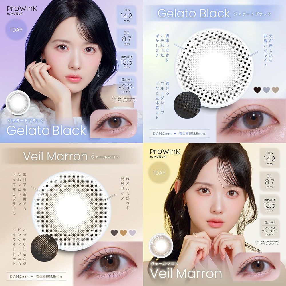 「商品情報」アイドルメイクのプロがつくるうるみ裸眼風レンズ「ProWink(プロウィンク)」アイドル担当ヘアメイク夢月プロデュース!夢月だからこそ見つけられた、可愛いのヒミツをぎゅっと詰め込みました。「主な仕様」アイドルメイクのプロがつくるうるみ裸眼風レンズ「ProWink(プロウィンク)」アイドル担当ヘアメイク夢月プロデュース!夢月だからこそ見つけられた、可愛いのヒミツをぎゅっと詰め込みました。 [ Gelato Black (ジェラートブラック) ] うるっと纏う、清涼ブラック。かくし味はひとさじの青みニュアンス。透明感メイクのひみつを瞳にも。 [ Veil Marron (ヴェールマロン) ] 甘さひそませ、ほの艶ブラウン。かくし味はさくら色のきらめき。ふんわり立体感で盛れる新感覚ブラウン。 【日本初※クリアなブルーライトカットの0.03mm極薄レンズ】瞳への優しさも可愛さもひとつに。わがままを叶える、毎日カラコン。※自社調べ:2025年7月時点、コンタクトレンズにおいて 【LENS FEATURE】0.03mm極薄レンズ/低含水38%/酸素透過率DK/t